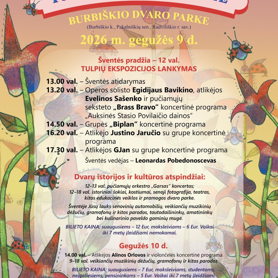 Tulpių žiedais muziejus kviečia grožėtis visą žydėjimo laiką, o lankytojų lauks ir daugiau renginių. Šventė tęsis gegužės 10 dieną 14 valandą – Burbiškio dvaro parke skambės atlikėjos Alinos Orlovos ir violončelės koncertinė programa, veiks muzikinių dėžučių ir gramofonų, muziejaus istorijos ir kitos parodos.