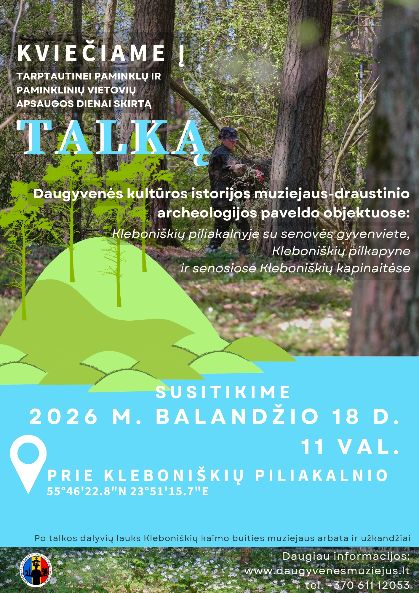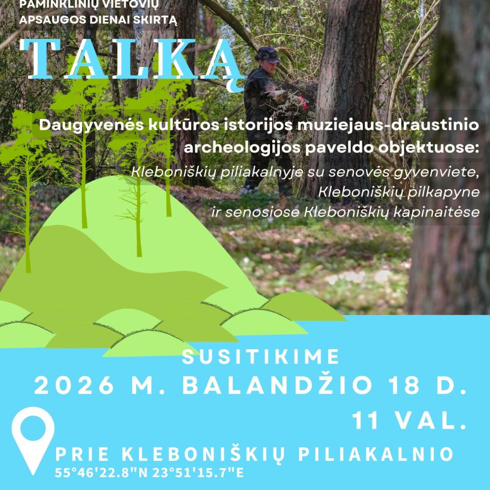 Talka vyks Daugyvenės kultūros istorijos muziejaus-draustinio archeologijos paveldo objektuose – Kleboniškių piliakalnyje su senovės gyvenviete, Kleboniškių pilkapyne ir senosiose Kleboniškių kapinaitėse.
