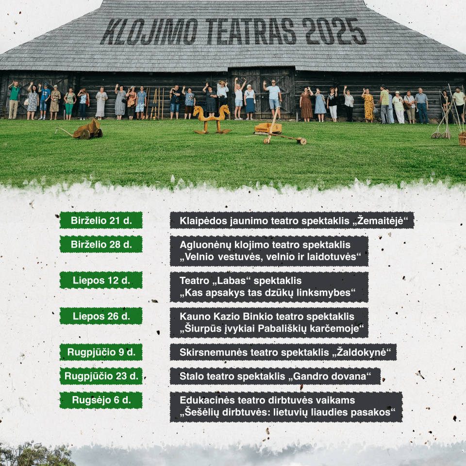 Birželio 21 dieną Daugyvenės kultūros istorijos muziejaus-draustinio Kleboniškių kaimo buities muziejuje prasideda naujas teatro sezonas. Šiemet žiūrovus į šeštadienio popietes klojime pakvies šeši mėgėjų ir profesionalų teatrai, atspindintys Lietuvos etnografinius regionus, vyks edukacinės dirbtuvės vaikams.