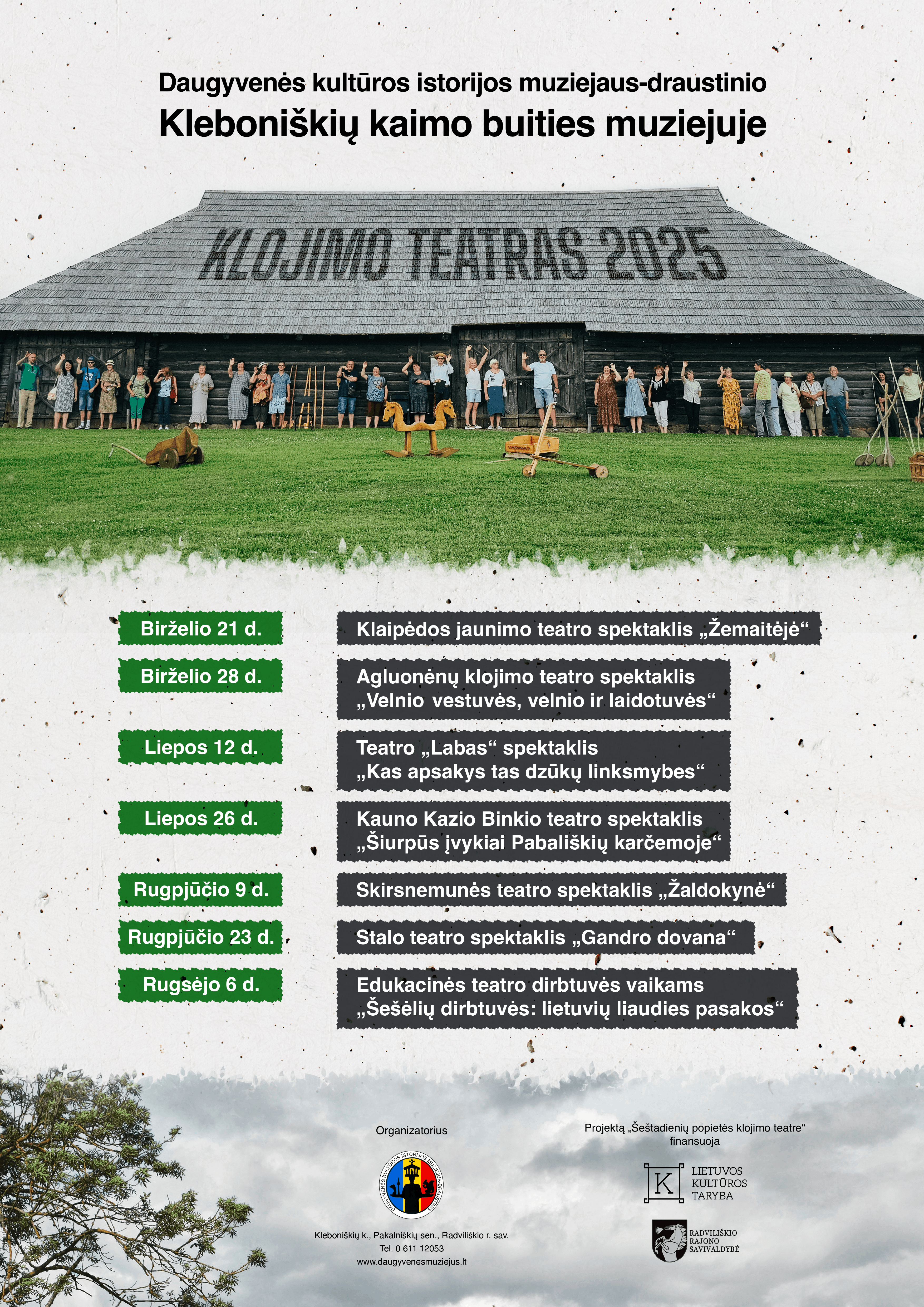 Liepos 12 dieną Kleboniškių kaimo buities muziejuje skambės dzūkų tarmė: teatras „Labas“ vaidins spektaklį „Kas apsakys tas dzūkų linksmybes“ (rež. V. Mockevičiūtė, N. Varnelytė), o liepos 26 dieną svečiuosis Kauno Kazio Binkio teatras su nuotaikingu vaidinimu „Šiurpūs įvykiai Pabališkių karčemoje“ (rež. Nida Vita Žilinskienė).