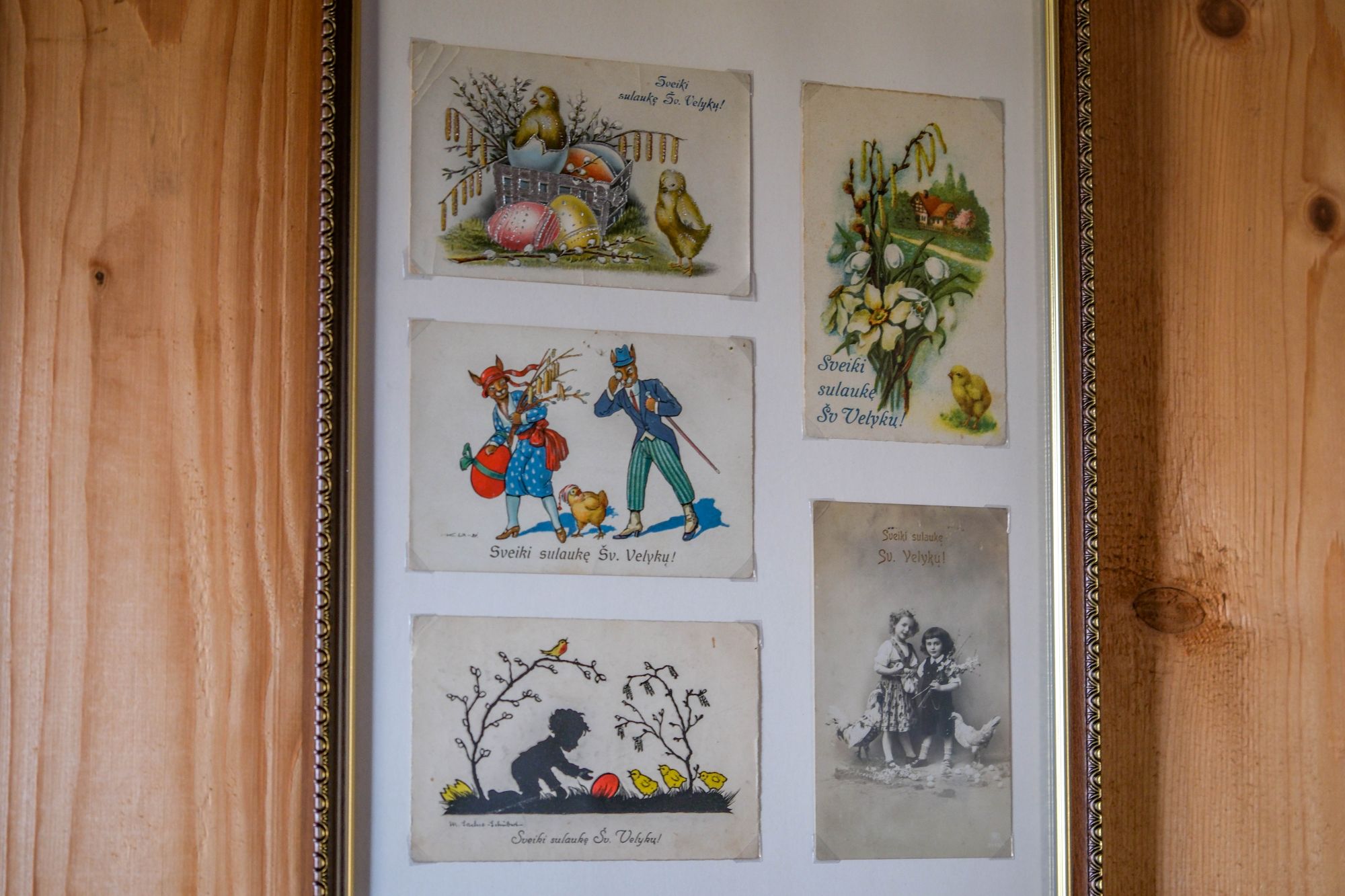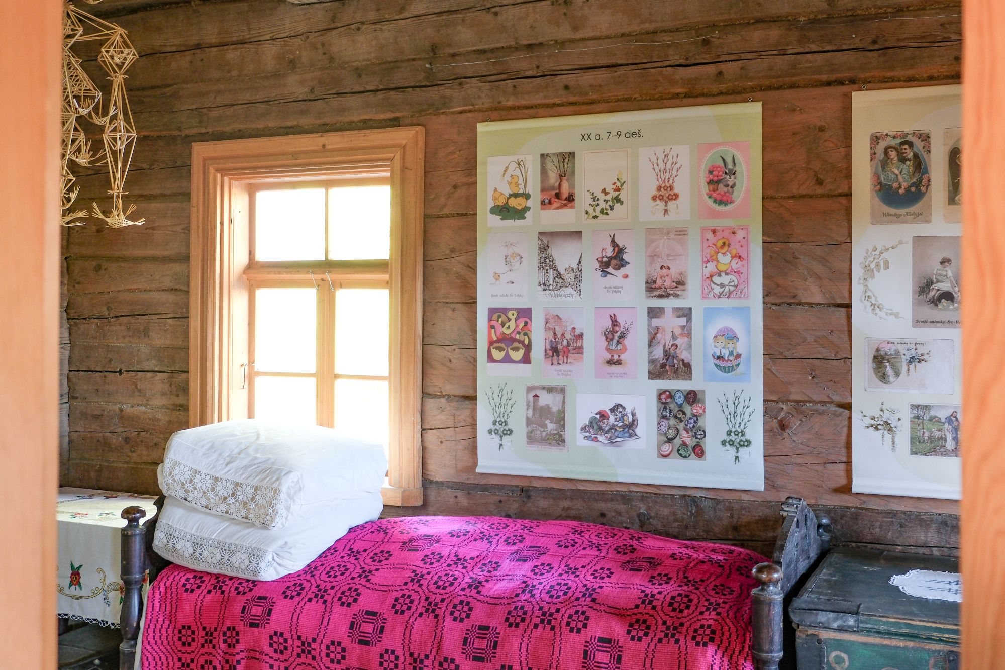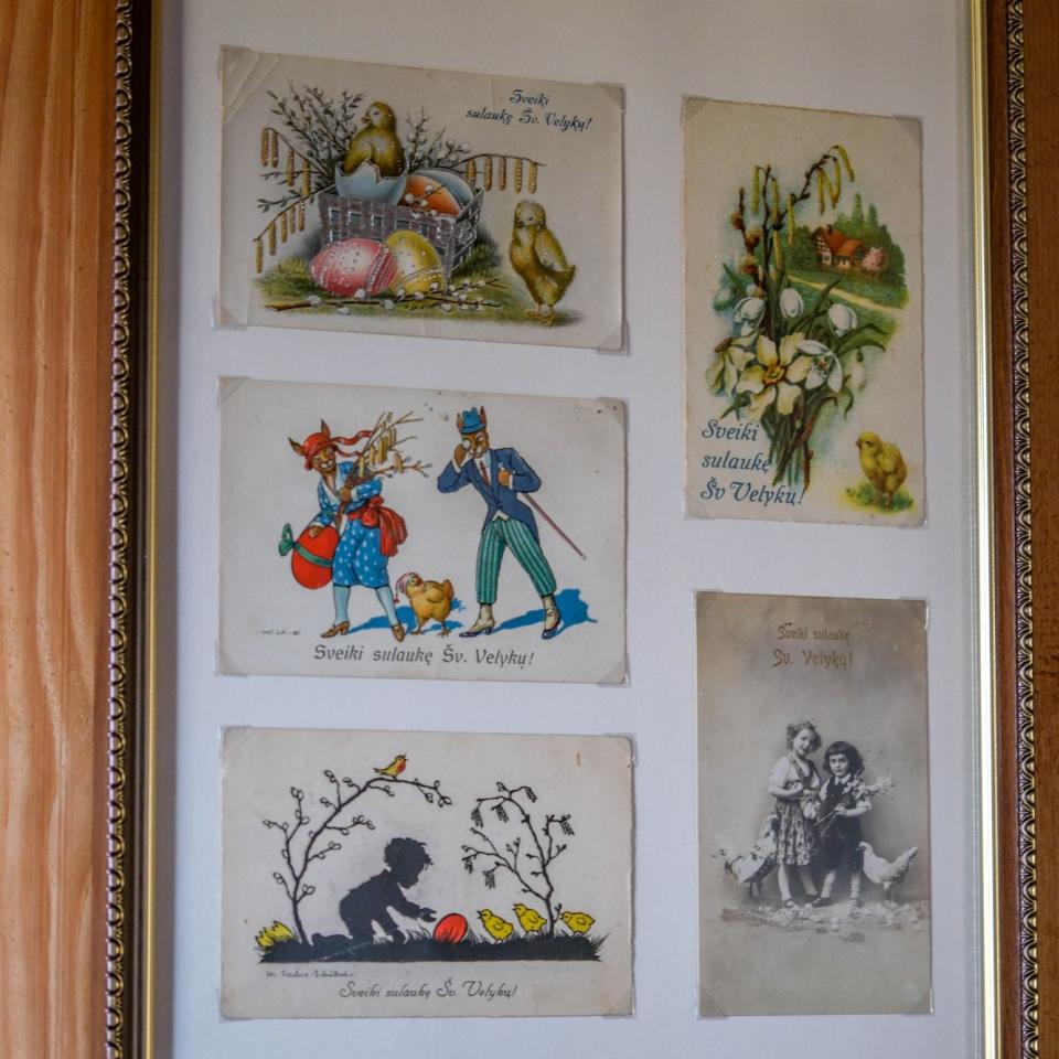 Virš stalo supasi velykiniai paukščiukai, kaip ir prieš daugelį metų, sukurti iš tuščių kiaušinių ir popieriaus. Ant sienų, šalia šventųjų paveikslų, papuoštų žiedais, eksponuojami XX a. lietuviški velykiniai sveikinimų atvirukai. „Sveiki sulaukę šv. Velykų!“ – atskrieja linkėjimai iš praeities.