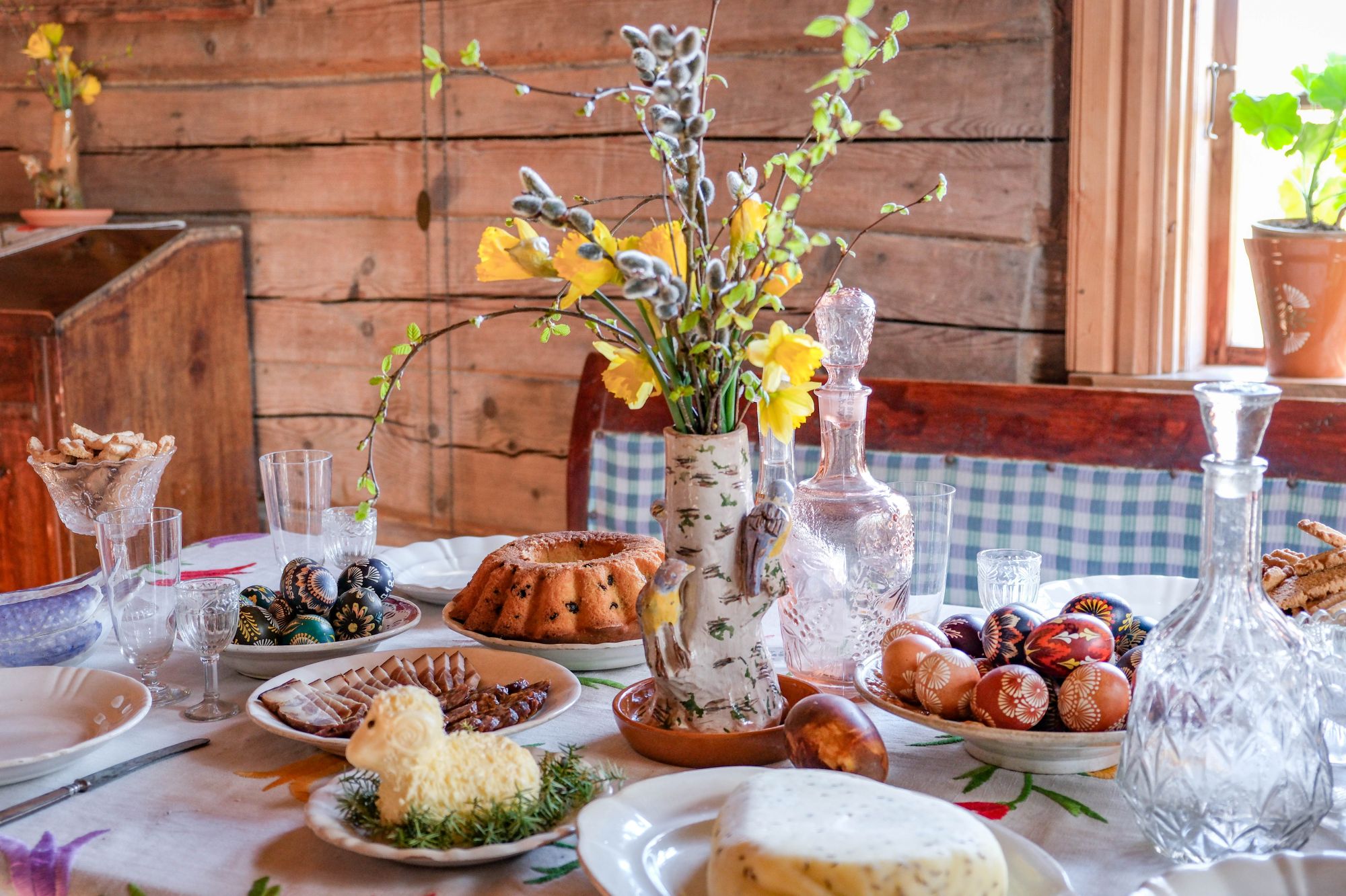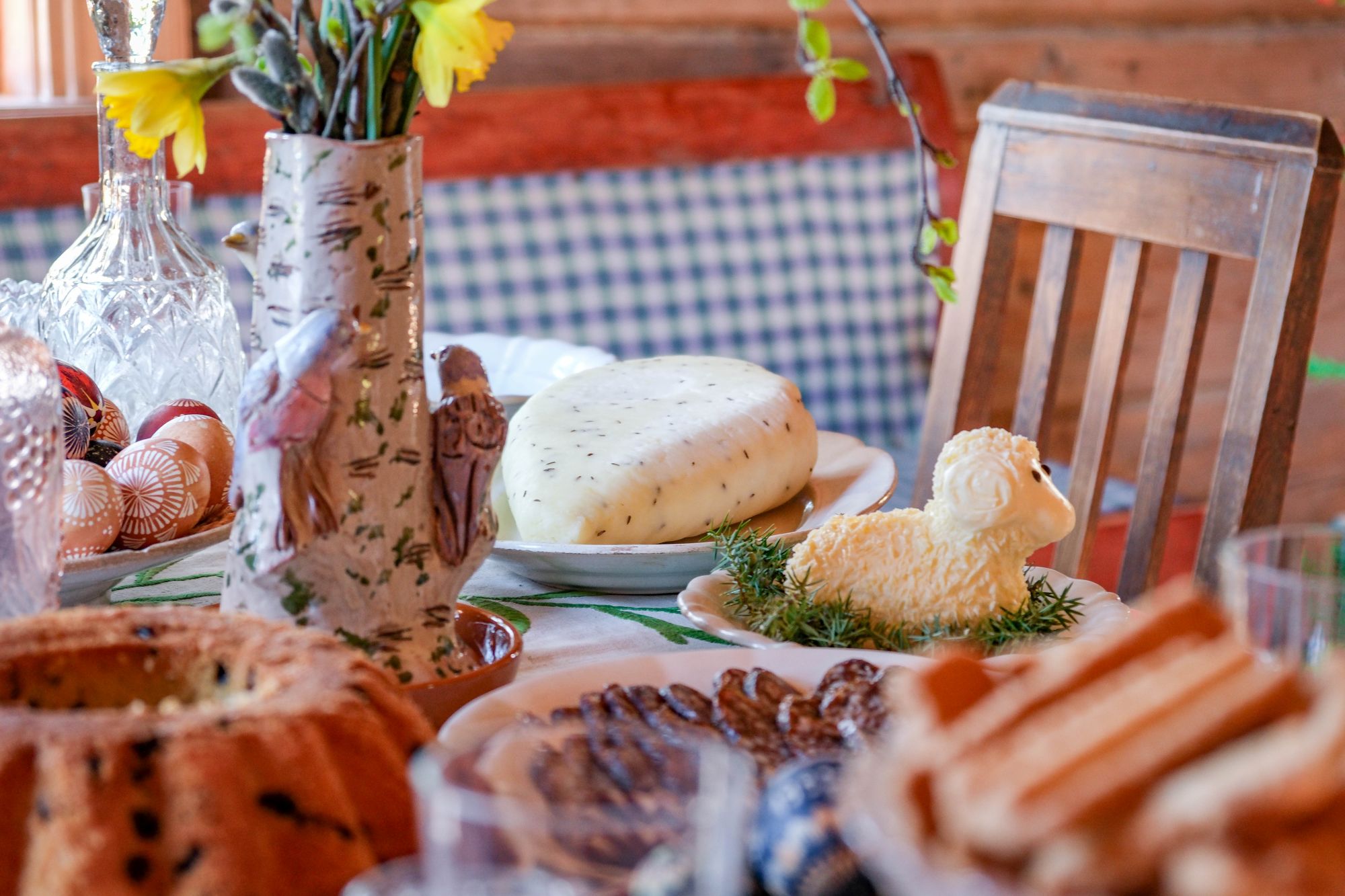 Ant siuvinėta staltiese užtiesto stalo išdėlioti šventiniai indai ir valgiai: duona ir pyragas, sūris, velykinė boba, sviestinis avinėlis... Atrodo, kad šeimininkai, sugrįžę iš bažnyčios, tuoj sės prie vaišių stalo.