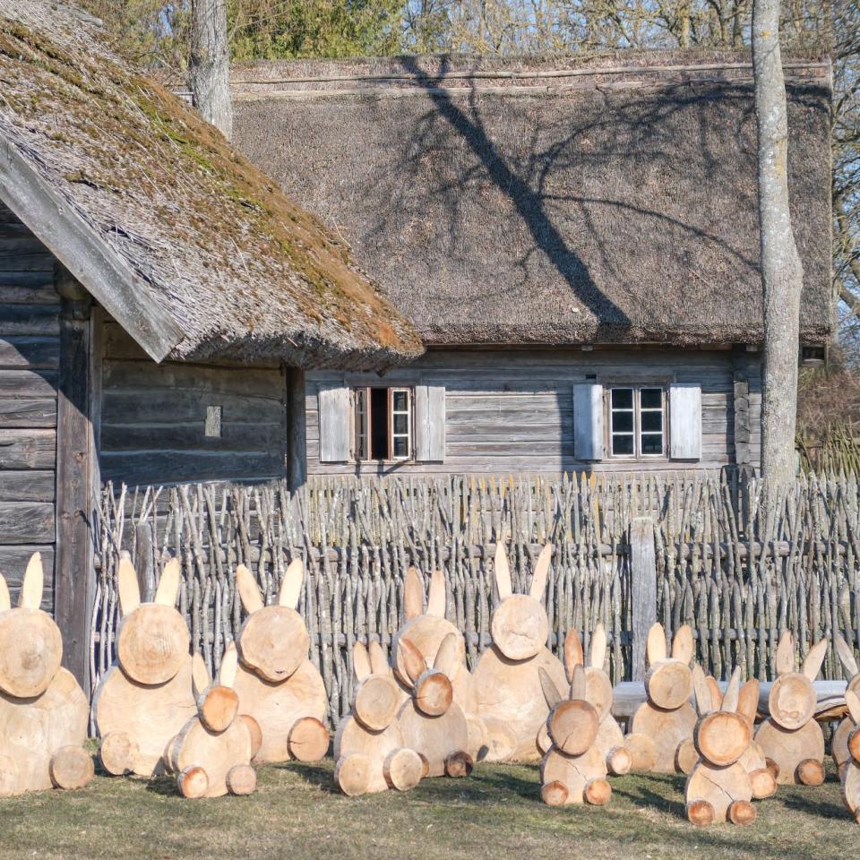 Popietės dalyvius Kleboniškių kaimo buities muziejuje sutiks ir išlydės viename iš kiemų susibūrusi linksma medinių zuikių kompanija – zuikiai dažnai matomi velykinių sveikinimų atvirukuose.