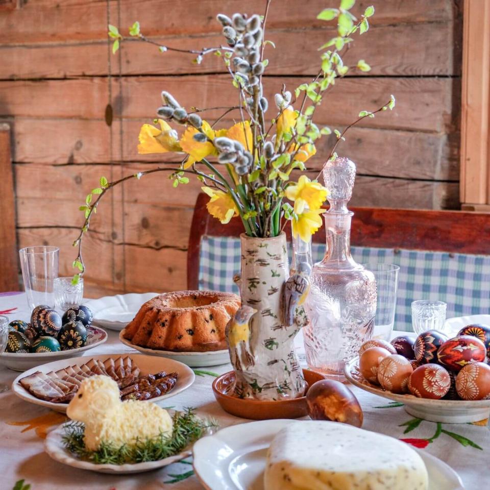 Ant siuvinėta staltiese užtiesto stalo išdėlioti šventiniai indai ir valgiai: duona ir pyragas, sūris, velykinė boba, sviestinis avinėlis... Atrodo, kad šeimininkai, sugrįžę iš bažnyčios, tuoj sės prie vaišių stalo.