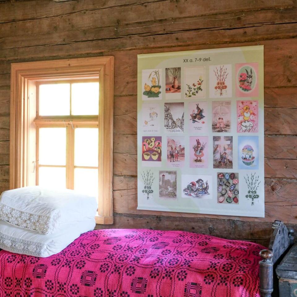 Virš stalo supasi velykiniai paukščiukai, kaip ir prieš daugelį metų, sukurti iš tuščių kiaušinių ir popieriaus. Ant sienų, šalia šventųjų paveikslų, papuoštų žiedais, eksponuojami XX a. lietuviški velykiniai sveikinimų atvirukai. „Sveiki sulaukę šv. Velykų!“ – atskrieja linkėjimai iš praeities.